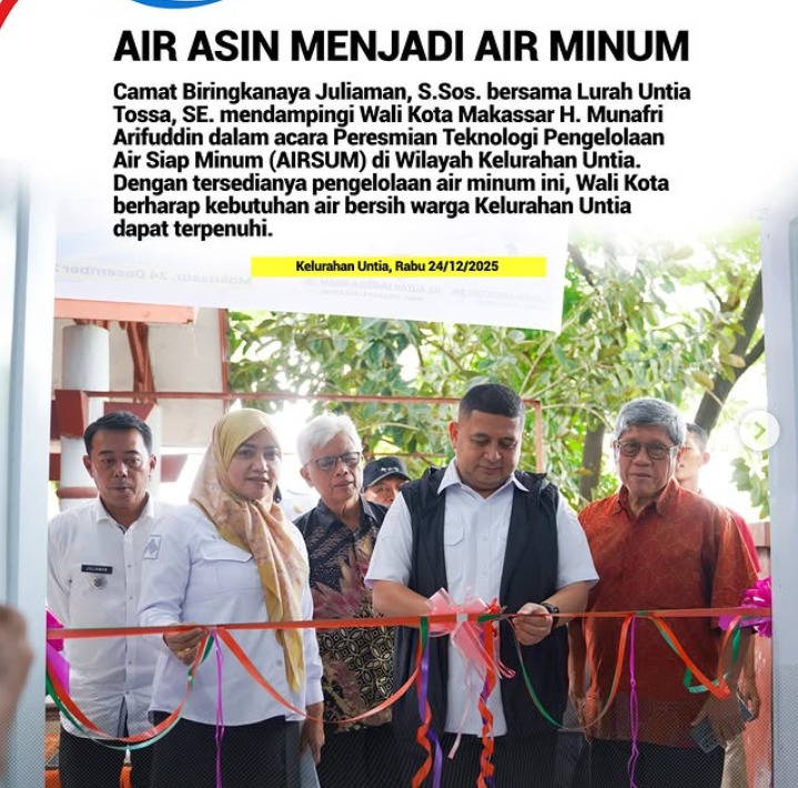 GEMPAR NEWS__(Makassar, Rabu 24/12/2025)-Kecamatan Biringkanaya kembali mencatatkan langkah strategis dalam sejarah pelayanan publik Kota Makassar. Air asin yang selama puluhan tahun menjadi tantangan utama warga pesisir, kini resmi diubah menjadi air siap minum melalui peresmian Teknologi Pengelolaan Air Siap Minum (AIRSUM) di Kelurahan Untia.