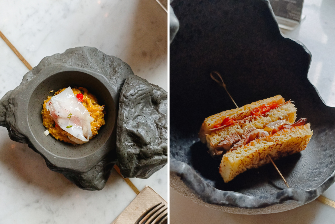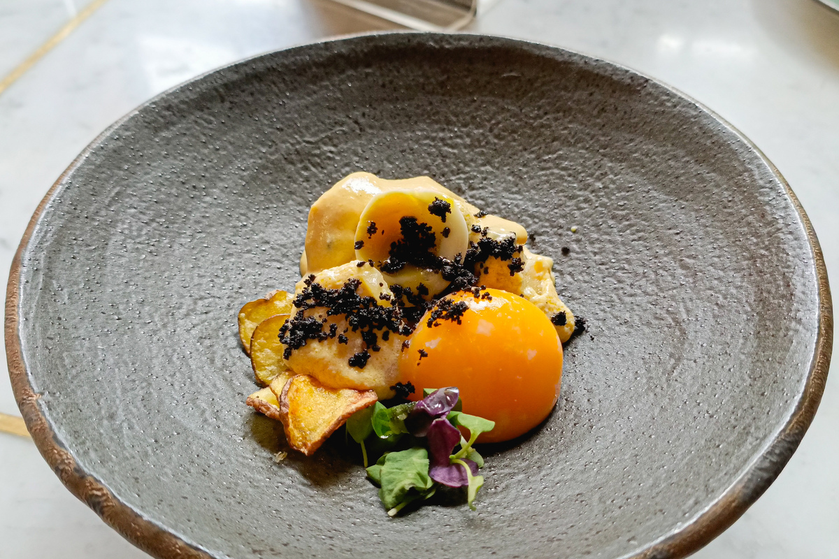 Masih dalam hidangan creamy, semangkuk Humita kemudian datang. Makanan ini jadi hidangan paling light dan familiar karena terdiri dari campuran krim jagung yang manis dan pancetta dengan chimichurri dan guanciale. Di atasnya terdapat seiris pork cheek yang kenyal, terasa balance dan nyaman di mulut. Presentasi hidangan Humita jadi yang paling unik karena dihidangkan di atas sebuah mangkuk batu.