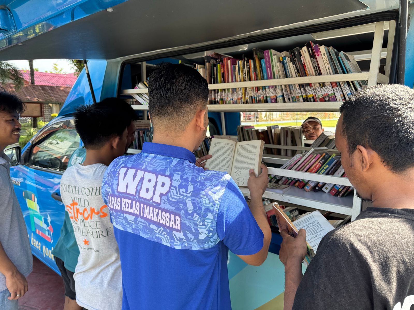 Perpustakaan keliling yang dilengkapi dengan beragam koleksi buku, mulai dari bacaan umum hingga buku pengembangan diri dan keagamaan, menjadi sarana edukatif bagi warga binaan untuk mengisi waktu dengan kegiatan yang positif dan bermanfaat.